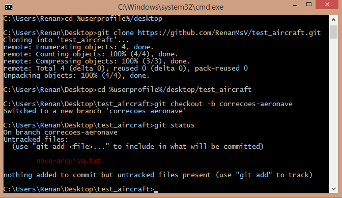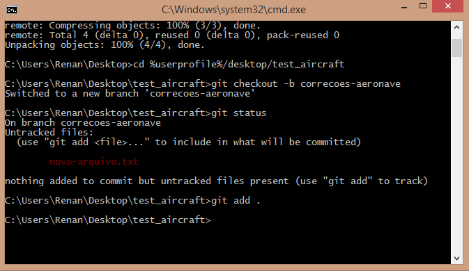 O CMD irá mostrar “switched to a new branch ‘correcoes-aeronave’”, que significa que voce conseguiu criar uma nova branch com sucesso! e ela contem todos arquivos da branch master.