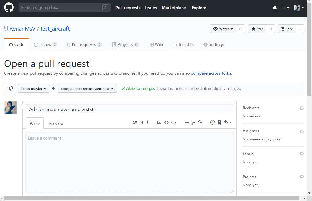 Para criar uma pull request vá no seu repositorio neste caso https://github.com/RenanMsV/test_aircraft, no botão chamado branch escolha a branch correcao-aeronave