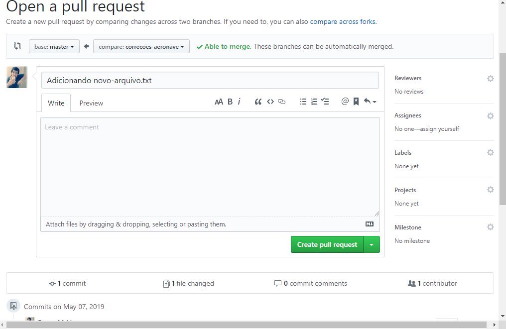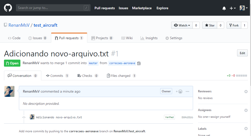 Pronto, agora sua pull request foi criada e o dono do repositorio pode então aceitar ou recusar suas alterações. Caso o dono de pedir para alterar algo em sua correção basta fazer essas alterações, commitar, e fazer o push novamente. Não é necessario abrir nova pull request.