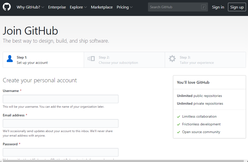 Para utilizar o Github é preciso criar uma conta nele: Crie sua conta - https://github.com