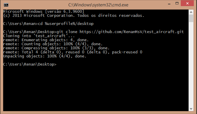 No meu caso a url é essa https://github.com/RenanMsV/test_aircraft.git. Agora abra o CMD do windows (para abrir faça a combinação de tecla Windows + R, digite cmd e aperte Enter).